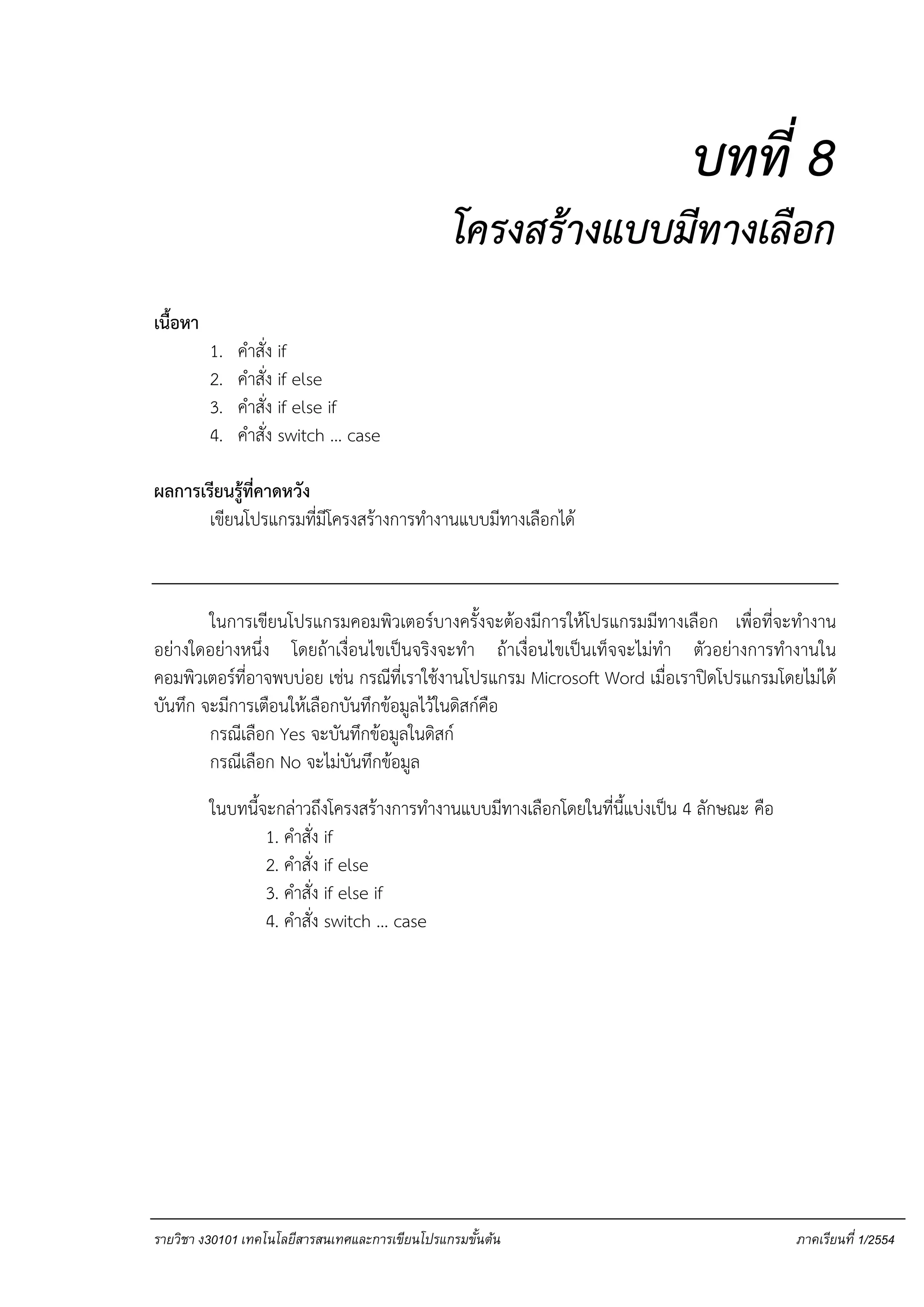 ในบทนี้จะกล่าวถึงโครงสร้างการทํางานแบบมีทางเลือกโดยในที่นี้แบ่งเป็น 4 ลักษณะ คือ