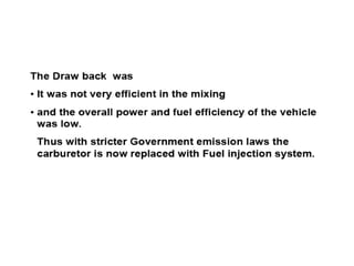 This document discusses how a 4-stroke engine works and provides details on engine specifications like CC size and calculations. It also covers fuel injection systems, benefits of multi-port fuel injection, engine management technology, and steering systems like electronic power steering. Key terms defined include CC, bore, stroke, cylinders, fuel injection, ECM, and specifications like ground clearance and turning radius.