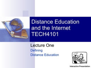 This document defines distance education and discusses its history. Distance education involves physical or time separation between students and instructors, with educational technology used to connect them and transmit course content. It has existed since the 1700s through correspondence education, but technology-based distance education emerged in the early 1900s with audiovisual devices in schools. The history shows new technologies balanced against resistance to change, with distance education trying to blend with traditional education while adapting to evolving learning theories and technologies.