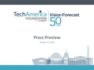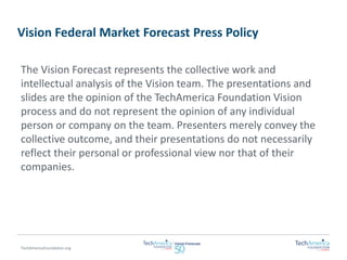 The document provides an overview of the TechAmerica Foundation's Vision Federal Market Forecast. It summarizes the research methodology, which included over 360 interviews and forecasts from 25 teams covering 10 years for defense and 5 years for civilian IT budgets. The macroeconomic and defense forecast anticipates modest growth in the DoD topline and notes potential disruptors. The federal IT forecast projects total IT spending to grow at a 2.6% CAGR from FY2015-2020. The civilian forecast anticipates 2.8% growth while the defense forecast shows 2.5% growth over the same period. Key challenges identified include ongoing budget pressure and the need for cost savings and transformation amid technology transitions.