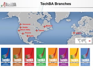 The document discusses TechBA, a program that helps technology companies expand globally. It provides details on TechBA's branches, focus sectors in Seattle like information technology, aerospace, and biotechnology. It outlines TechBA Seattle's results in generating international sales and jobs for participating companies. The document also summarizes a bootcamp program that TechBA runs to help companies develop minimum viable products and test hypotheses over 5 weeks.