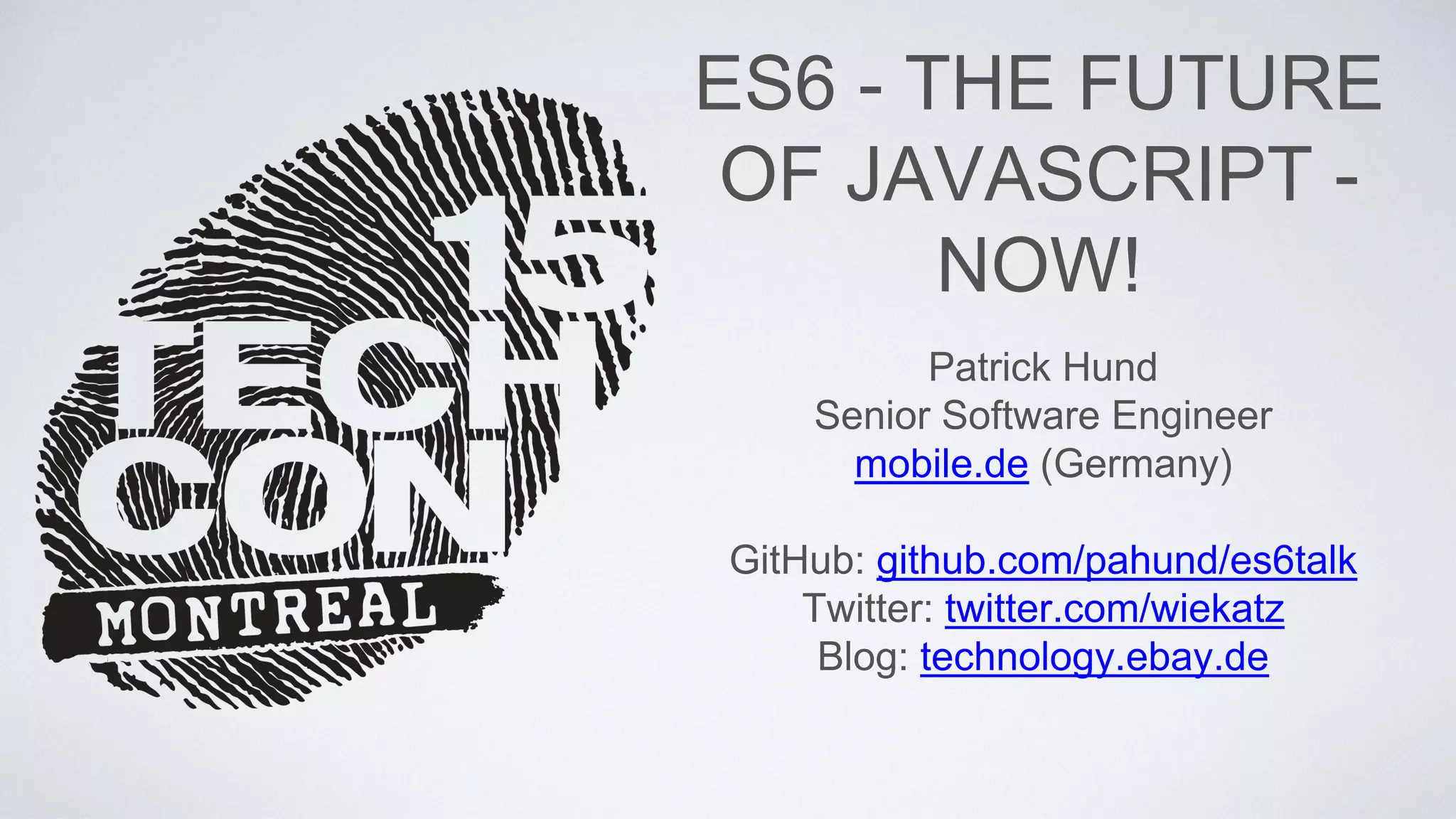 The document discusses the future of JavaScript with a focus on ES6, presented by Patrick Hund, a senior software engineer. It includes resources such as code examples on GitHub, learning materials on babel.io, and links to relevant blogs. The presentation emphasizes the importance of ES6 features and provides avenues for further learning.
