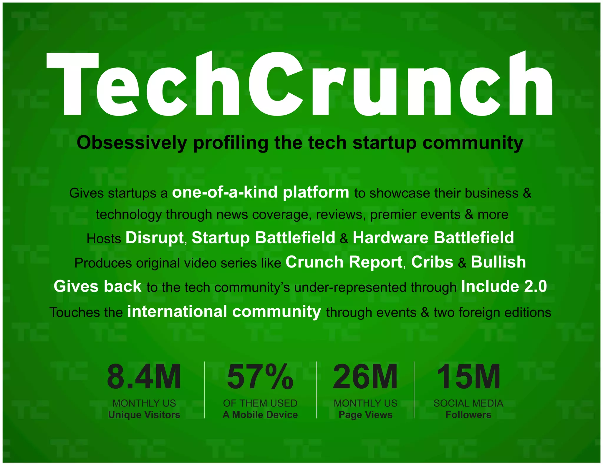 TechCrunch is a media company that provides news coverage and events focused on the tech startup community. It reaches millions of readers through its website, social media followers, newsletters, and mobile apps. TechCrunch hosts several major annual events that bring together startups, investors, and others in the tech industry, including Disrupt, Startup Battlefield, and The Crunchies awards ceremony. It also organizes local meetups and pitch competitions around the world to support regional startup ecosystems.