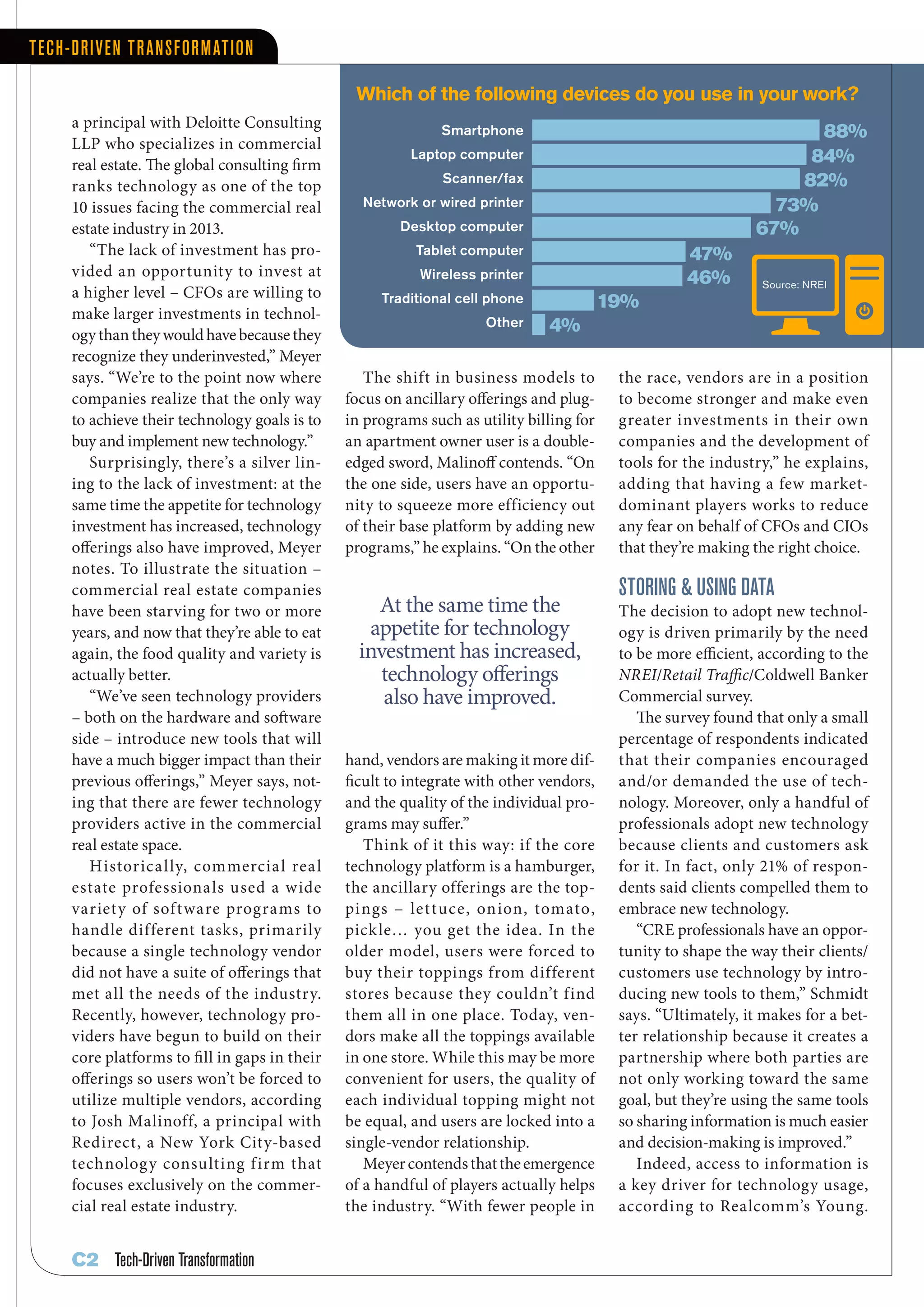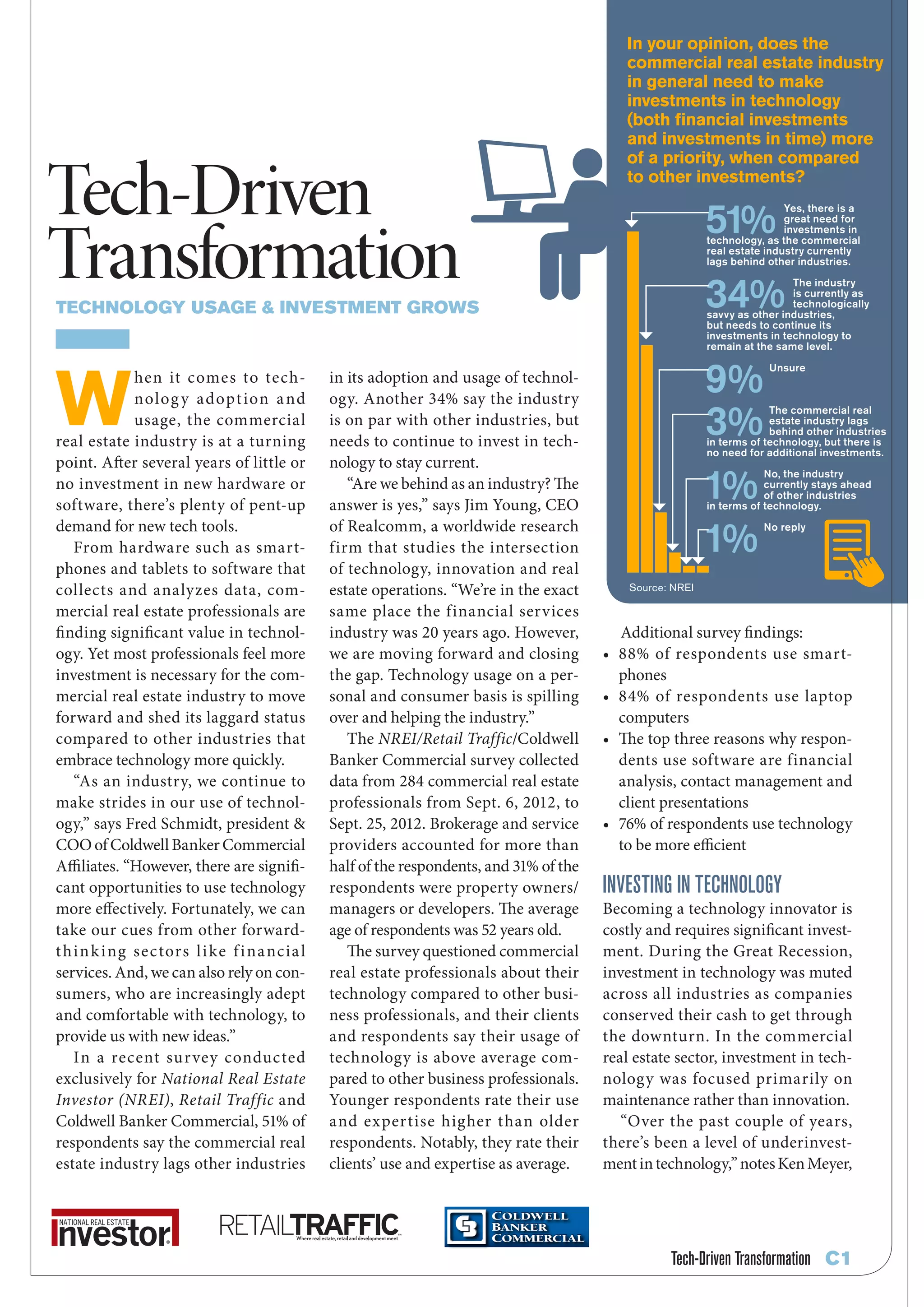 The document discusses the need for the commercial real estate industry to prioritize technology investments, with 51% of professionals believing the sector is lagging behind others and requires significant tech upgrades. It highlights the overall trend of increasing technology usage among real estate professionals, with 88% using smartphones, and emphasizes that younger respondents show greater adoption rates. While social media and data management are acknowledged as key areas for improvement, many professionals remain uncertain about the effectiveness of their social media efforts in generating business.