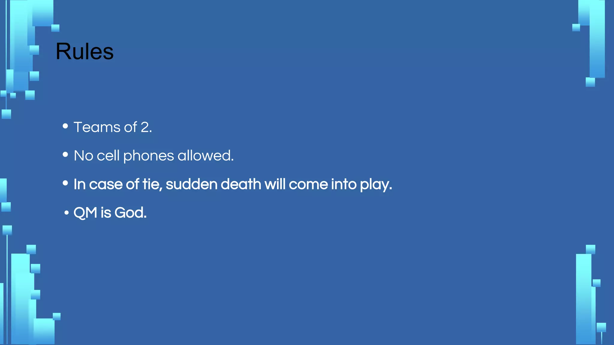 3. The quiz is designed for teams of 2 people with rules against cell phones and includes a sudden death tiebreaker round led by the Quiz Master (QM).