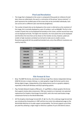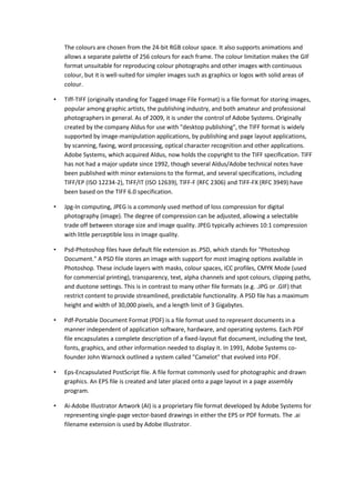 2. It summarizes several common file formats (BMP, PNG, GIF, TIFF, JPG, PSD, PDF, EPS, AI) and what types of images they are best suited for.