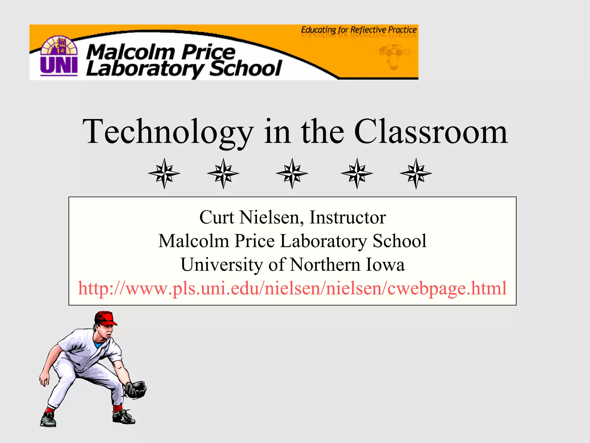 The document discusses using technology in the classroom and provides recommendations for teachers. It lists common classroom technologies like computers, the internet, and smart boards. It notes that teachers should check district acceptable use policies and obtain web permissions from students. The benefits of technology are outlined as enhancing student interest, increasing academic resources, and exposing students to new places. Classroom management tips include setting guidelines and demonstrating proper technology usage.