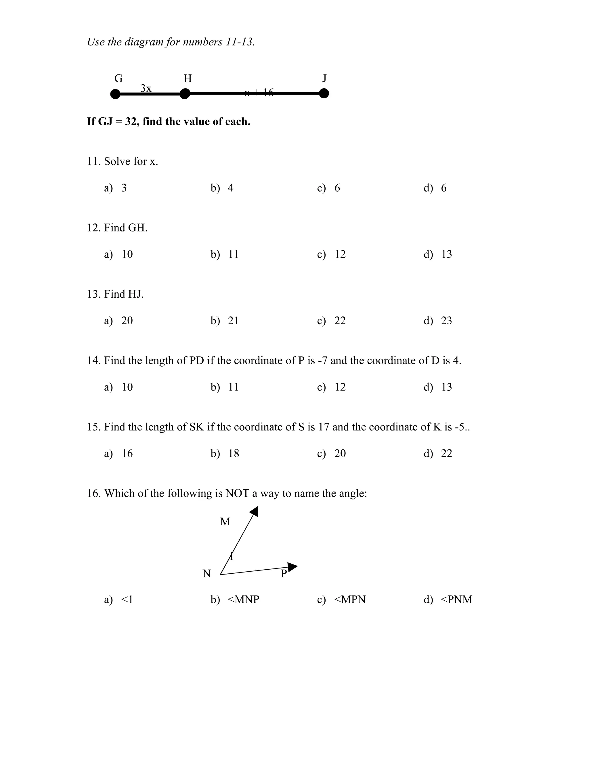 The document contains geometry problems involving angles, lines, line segments, rays, and parallel and perpendicular lines. It asks the reader to solve equations for variables, find lengths of line segments, identify angle measures and relationships, and match geometric terms to their definitions. It provides diagrams to aid in solving problems about angles, intersections, and parallelism.