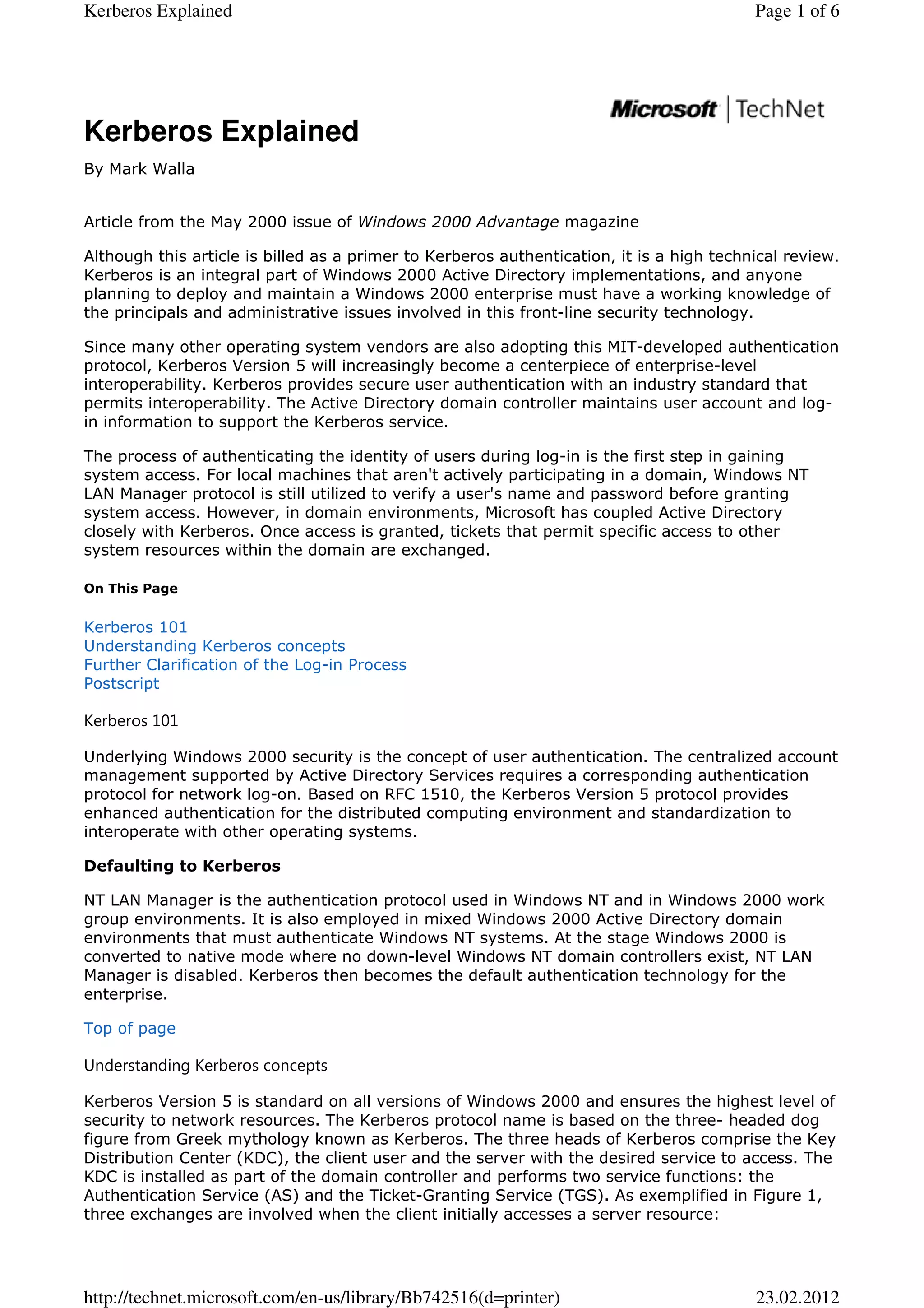 Kerberos is an authentication protocol that allows nodes communicating over a non-secure network to prove their identity to one another in a secure manner. It is integral to Windows 2000 Active Directory implementations. The document describes the Kerberos authentication process, which involves an initial authentication service exchange, a ticket-granting service exchange, and a client/server exchange between the user and domain controllers. It also discusses key concepts like tickets, ticket-granting tickets, and how Kerberos handles authentication in mixed and multi-domain environments.