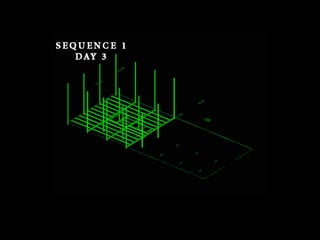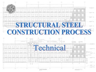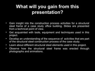 This presentation provides an overview of the construction process for a structural steel frame of a 4-story office building. It details the activities involved, including detailing, fabrication, transportation, and erection. Photographs and animations show the erection of the steel frame through its 6 sequenced phases. The overall goals are to introduce the user to the typical steps and provide technical insights into constructing a structural steel frame.