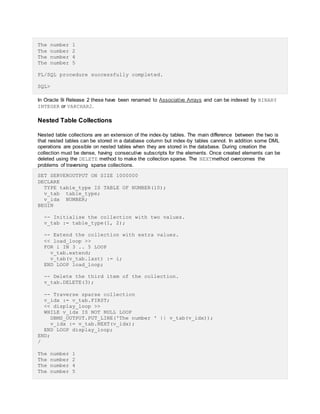 This document discusses collections in Oracle PL/SQL and provides examples of using different collection types such as index-by tables, nested tables, and varrays. It describes collection methods like EXISTS, COUNT, FIRST, LAST, etc. It also covers multiset operations on collections and creating multidimensional collections using record and nested table types. Triggers in Oracle are briefly introduced, including the different timing points of before/after statement and before/after each row triggers.