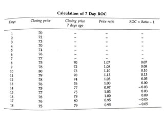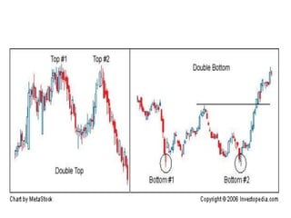- Key concepts include identifying primary, secondary, and minor trends in prices; recognizing common chart patterns like head and shoulders, double tops/bottoms; and determining pivot points, gaps, and support/resistance levels.