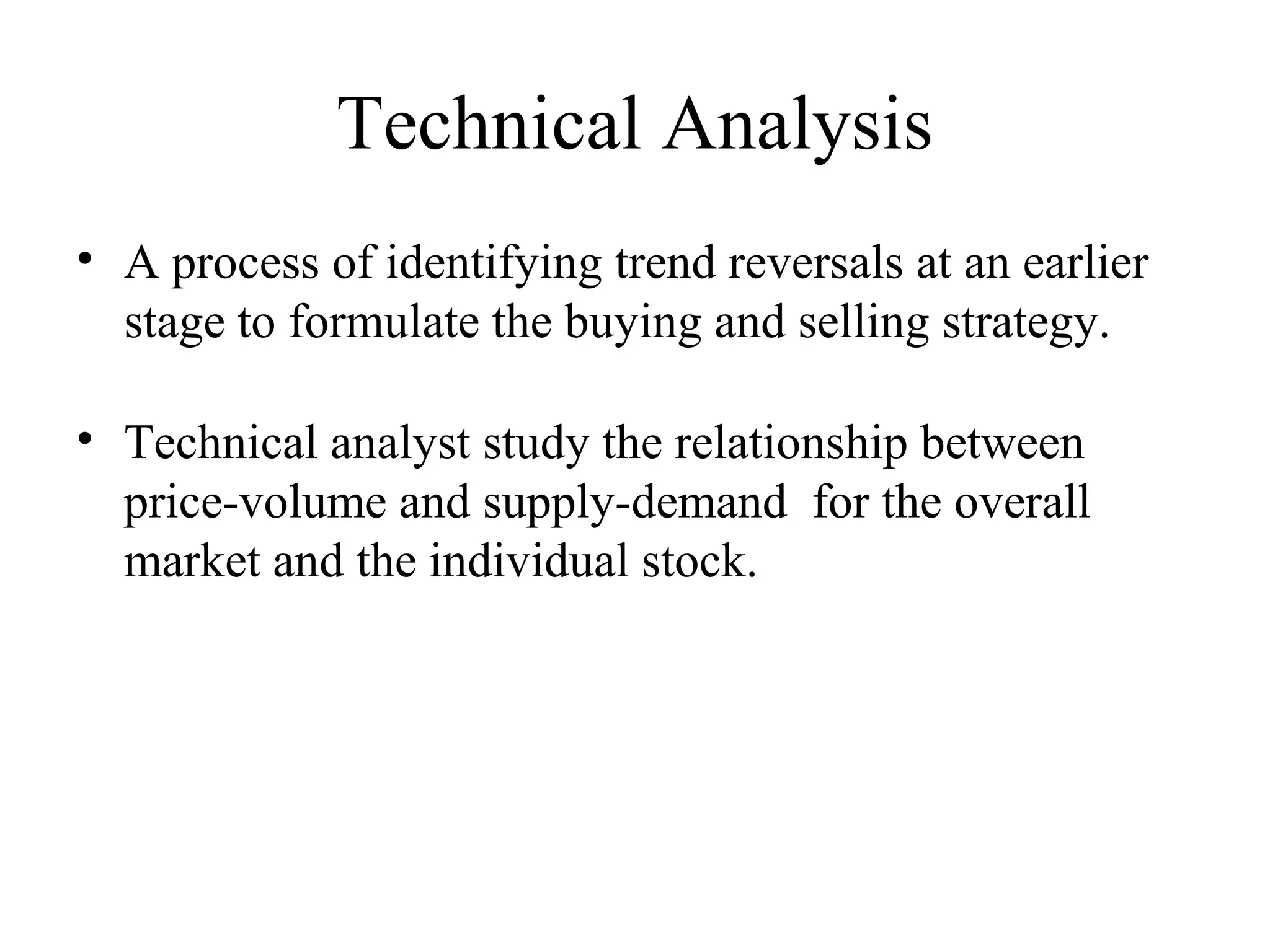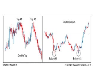 The document provides an overview of technical analysis techniques used to analyze stock price movements and identify trends. It discusses concepts like trend identification, support and resistance levels, moving averages, chart patterns, candlestick patterns, and indicators like pivot points and gaps. The origin and key assumptions of technical analysis are explained. Different chart types are described, including line charts, bar charts, and candlestick charts. Common patterns like head and shoulders, triangles, and flags are also outlined.