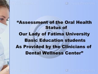 The document discusses a research study assessing the oral health status of basic education students at Our Lady of Fatima University. It aims to determine the students' demographic profiles, most common oral conditions, and current oral health status in terms of caries formation, calculus deposits, and number of extractions. The study also compares oral health factors between elementary and high school students. Overall results found that over half of students experienced dental caries, with the condition being more prevalent in females. Most students also had supragingival plaque and calculus deposits. The Philippines generally has poor oral health among children according to national survey data.