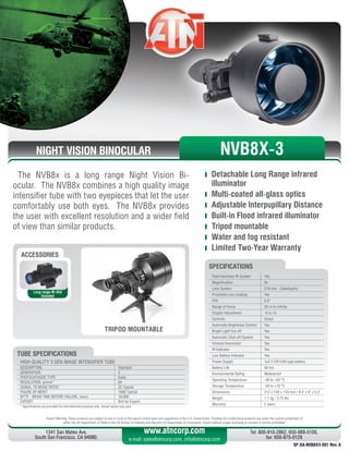 The NVB8x night vision binocular is designed for long range use. It has a high quality image intensifier tube, multi-coated optics, and provides a wider field of view than similar products. The binocular is water resistant, has an infrared illuminator, and can be mounted to a tripod for stable viewing at longer distances.