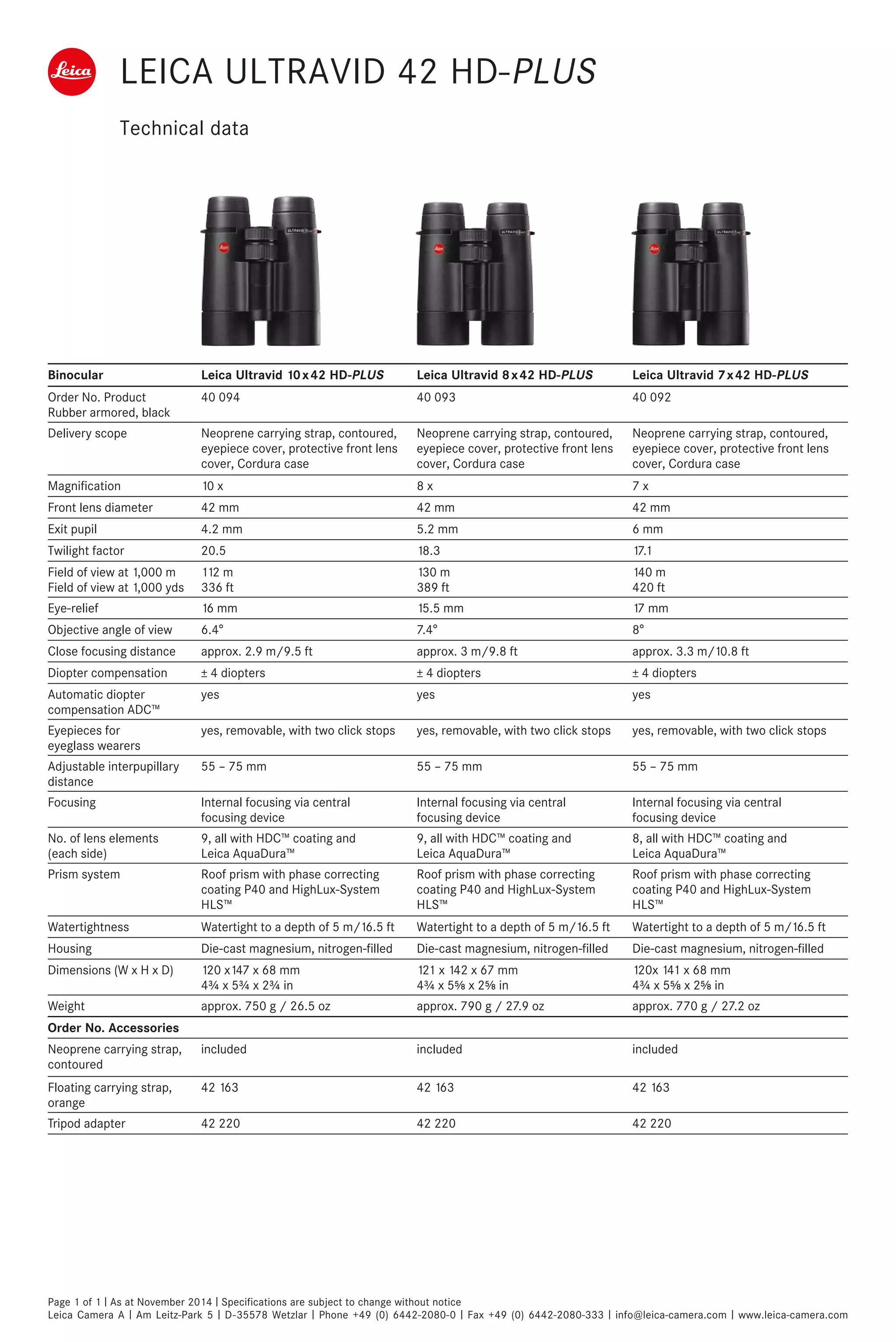 The document provides technical specifications for three binocular models from Leica: the Leica Ultravid 10x42 HD-PLUS, Leica Ultravid 8x42 HD-PLUS, and Leica Ultravid 7x42 HD-PLUS. All three models feature HDCT coating, waterproofing to 5 meters, die-cast magnesium housing, and adjustable inter-pupillary distance from 55-75mm. They differ in magnification, exit pupil size, twilight factor, field of view, number of lens elements, and weight. Accessories like carrying straps and a tripod adapter are also detailed.