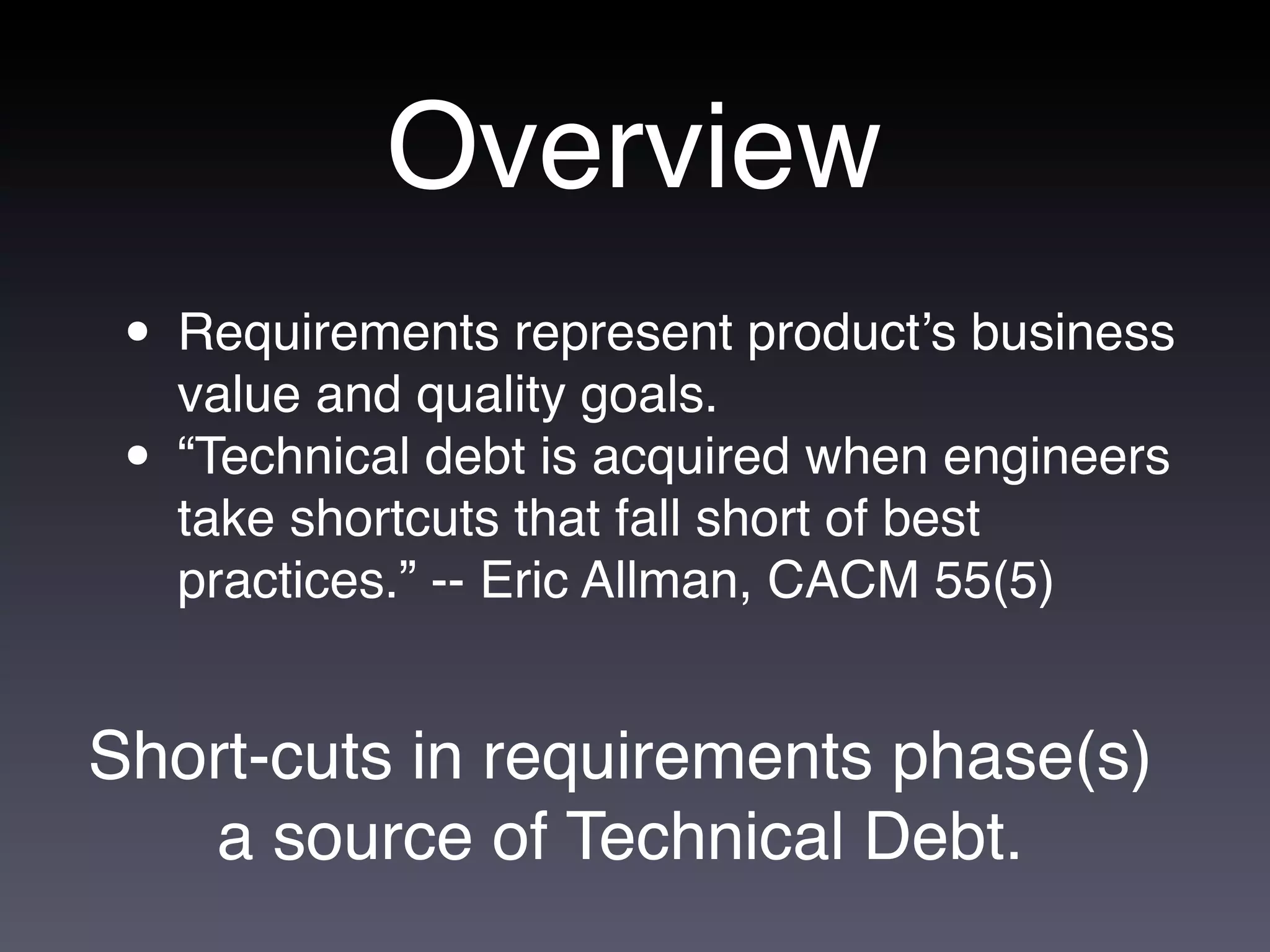 Technical debt arises from inadequate requirements analysis, risking missed intents and necessitating rework, which can accumulate through project iterations. Properly capturing requirements is crucial for aligning software development with business value and quality objectives. Exploring the relationship between process debt and requirements debt, as well as methods to track them, is essential for improving software development practices.
