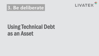 The document discusses technical debt in software development. It defines technical debt as shortcuts taken due to ambitious deadlines and lack of resources that reduce code quality. This leads to increased costs of maintenance and changes over time. The document recommends avoiding technical debt by using modular architectures, test-driven development, and shared coding standards. It suggests either refactoring code incrementally over time or deliberately taking on small, documented amounts of debt for bursts of new features before cleaning up. Technical debt can also be accepted but the interest costs must be managed.