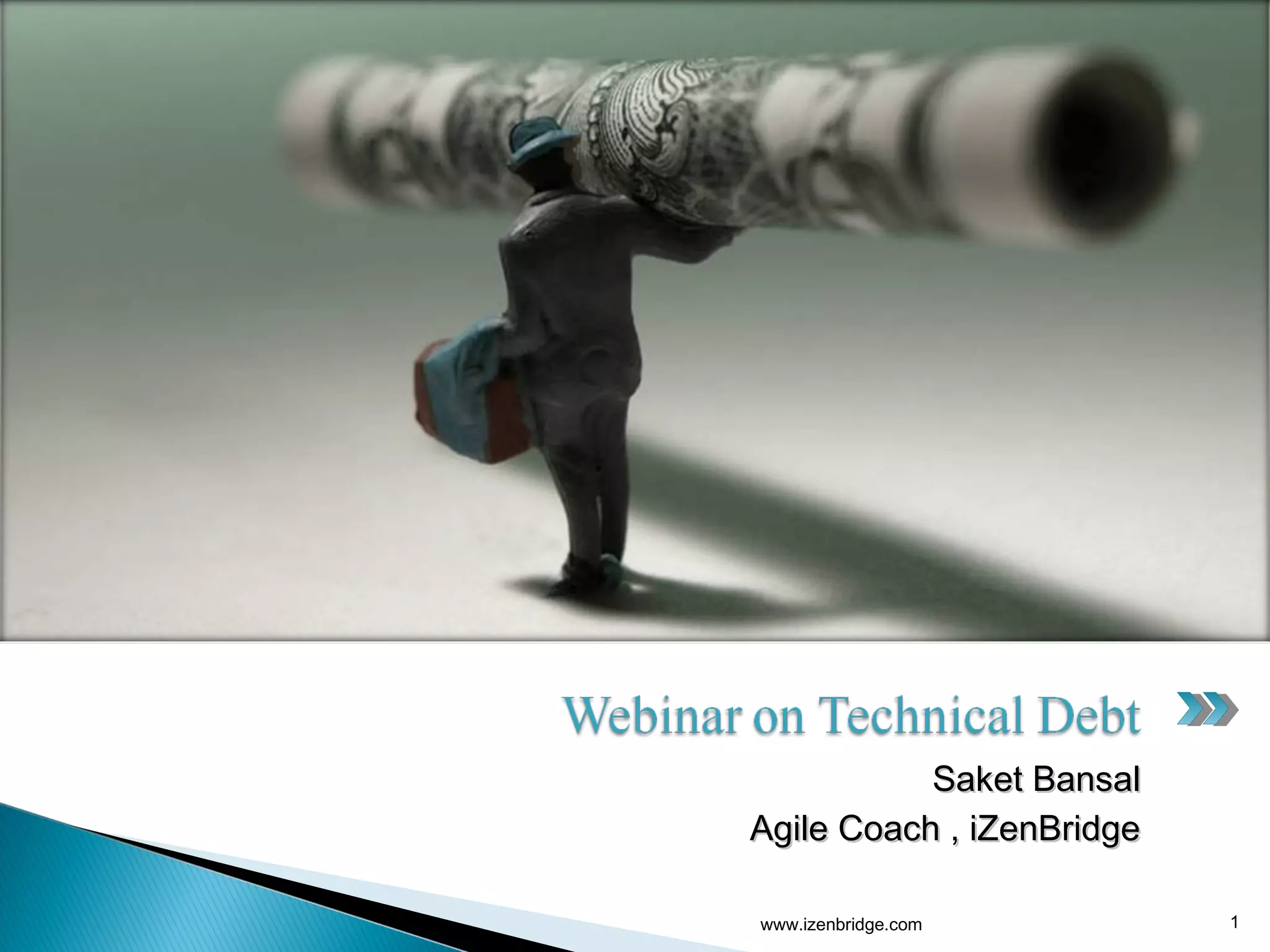 Technical debt is an incomplete or inadequate aspect of a software project that risks increased maintenance costs if not addressed. It includes imperfect designs, code that does not meet quality standards, lack of documentation, and missing or incomplete tests. While technical debt can increase productivity in the short term, it risks higher maintenance costs over time as interest accumulates. It is important to prioritize repaying high interest debt first while continuing to deliver customer value. Managing technical debt requires tracking it in a backlog and addressing it incrementally.