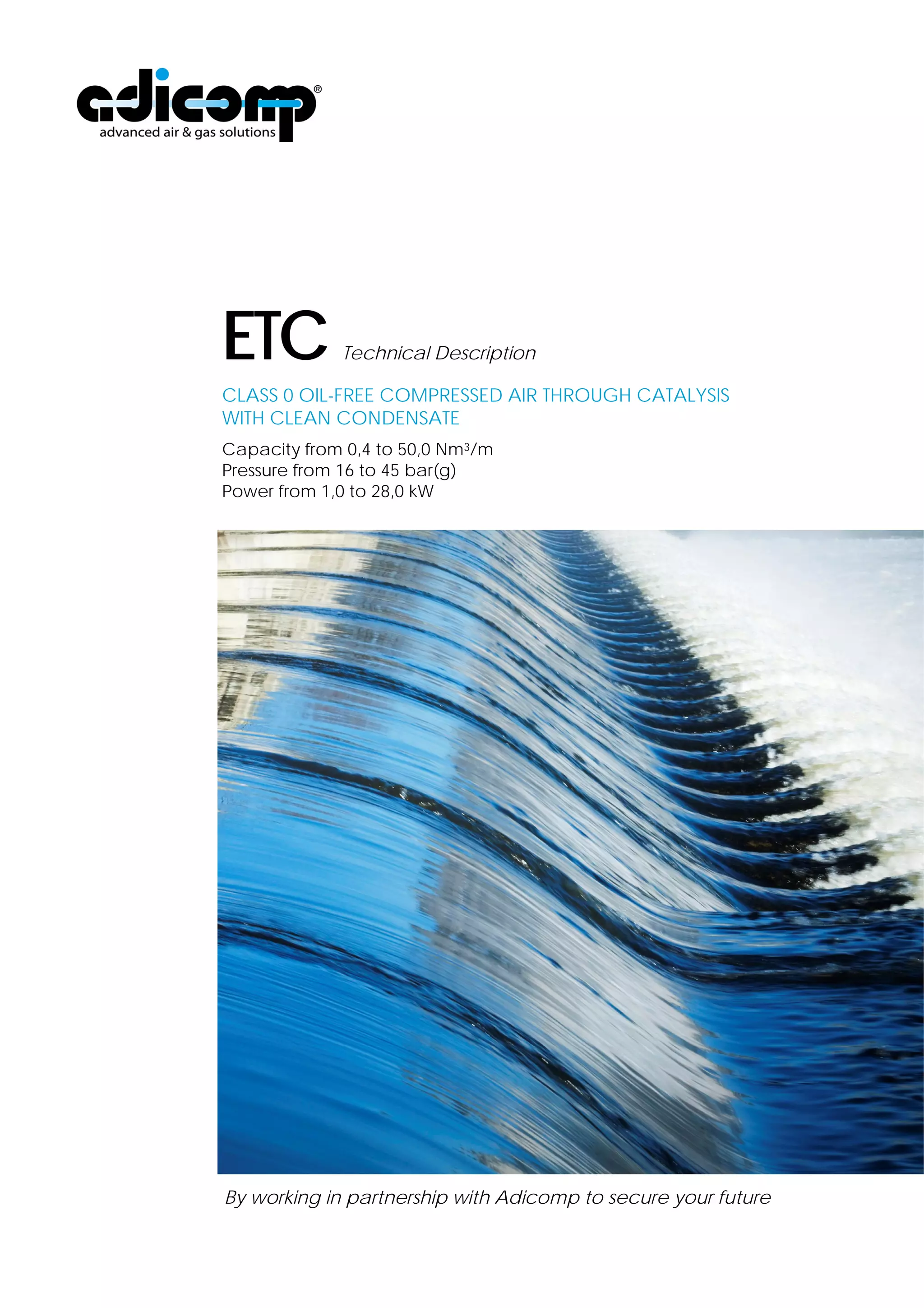 The document describes ETC catalytic air treatment systems for producing oil-free compressed air. ETC systems use catalytic oxidation to convert oil and hydrocarbons in compressed air into water and CO2, continuously producing Class 0 compressed air according to industry standards with residual oil content less than 0.0025 mg/Nm3. ETC systems offer guaranteed oil-free air quality for 20,000 hours of operation without risk of saturation from hydrocarbon compounds. The systems can treat air with up to 200 mg/Nm3 of oil and produce clean condensate.