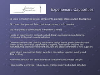The document provides a summary of Greg Sample's experience and consulting services. He has 28 years of mechanical design experience, specializing in manufacturing processes, tooling, and material selection. His consulting services include concept development, design for manufacturability, cost analysis, supplier evaluation, and project management. Recent projects include cost reduction work for Saw Stop and Ostendo Technologies, and new product development with Light Speed Aviation.