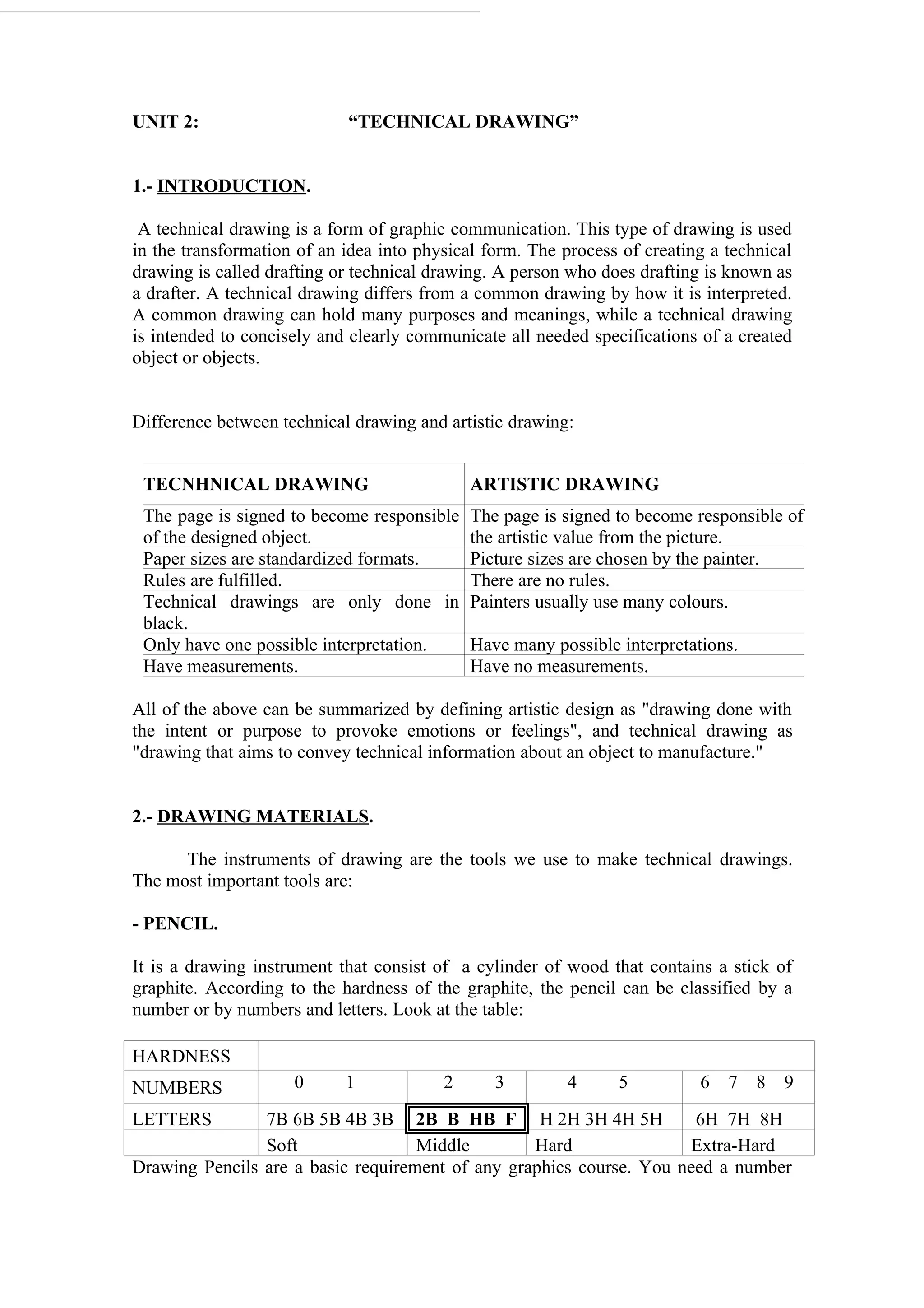The document provides an introduction to technical drawing and discusses the difference between technical drawings and artistic drawings. It notes that technical drawings aim to convey technical information to enable manufacturing of an object, while artistic drawings aim to provoke emotions. The document then discusses common drawing materials used for technical drawings such as pencils in various hardness grades and propelling pencils.