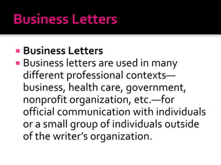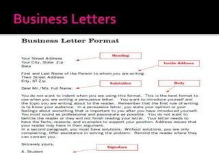 This document provides guidelines for writing effective business letters. It states that business letters are a formal form of communication used in professional contexts to contact individuals outside an organization. The document emphasizes establishing a "you attitude" by focusing on the reader, being clear and respectful, and avoiding first-person pronouns. It outlines the standard parts of a business letter, including the salutation, body, complimentary closing, and signature. Finally, it provides tips for starting the letter strongly and making the purpose clear from the beginning.