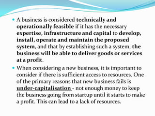 The document discusses the technical feasibility study that should be conducted for a new business. It outlines key areas that must be analyzed including selecting products/services, determining production needs, providing cost estimates, considering technological developments, and describing the manufacturing process, equipment requirements, facility needs, raw materials, and labor requirements. Conducting a thorough technical feasibility study is important to determine if the business has the necessary expertise, infrastructure and capital to operate successfully.