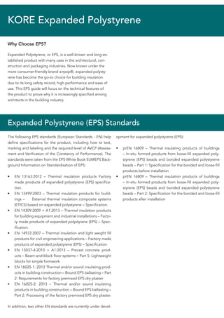 Kore expanded polystyrene (EPS), branded as airpop®, is widely used for insulation in the construction, architecture, and packaging industries due to its safety, performance, and ease of use. EPS is recyclable, has a low environmental impact, and is characterized by technical features such as moisture resistance, fire resistance, sound absorption, and cost-effectiveness. The document details the relevant European standards for EPS, its applications in the construction sector, and its certifications, highlighting its sustainability and versatility.