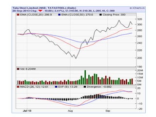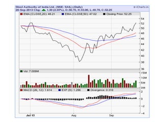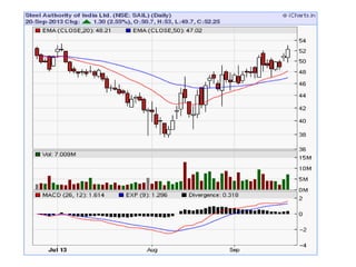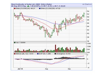 The document provides an analysis of the iron and steel industry in India, with a focus on Tata Steel and Steel Authority of India (SAIL). It discusses the industry background and structure, production and consumption scenarios, export-import trends, and SWOT analyses of Tata Steel and SAIL. Key ratios like EBITDA, debt-equity, return on capital employed, inventory turnover, fixed asset turnover, and adjusted profit after tax margin are presented for Tata Steel and SAIL for 2009 and 2013. The ratios show mostly declining trends from 2009 to 2013. PESTEL and technological factors are also analyzed for the industry.