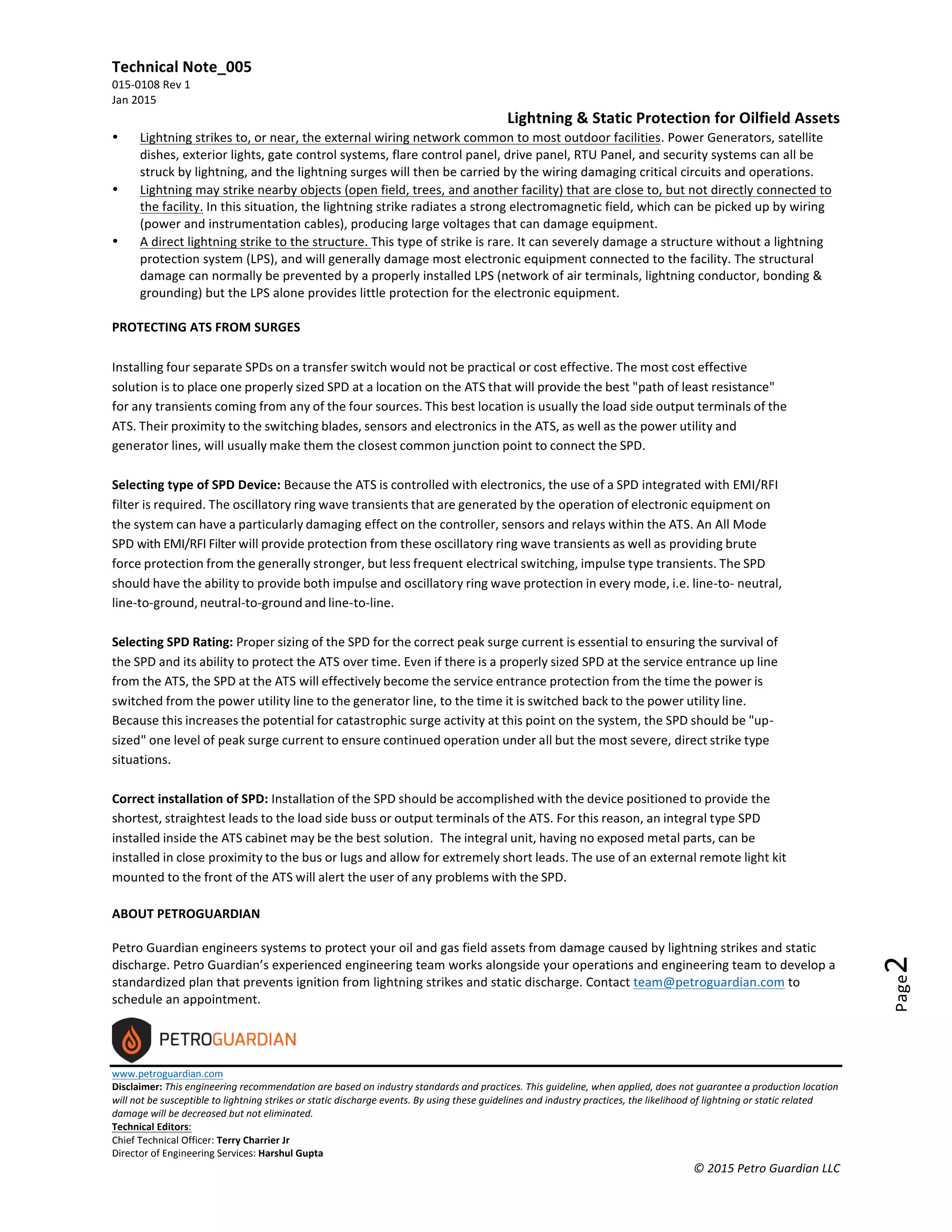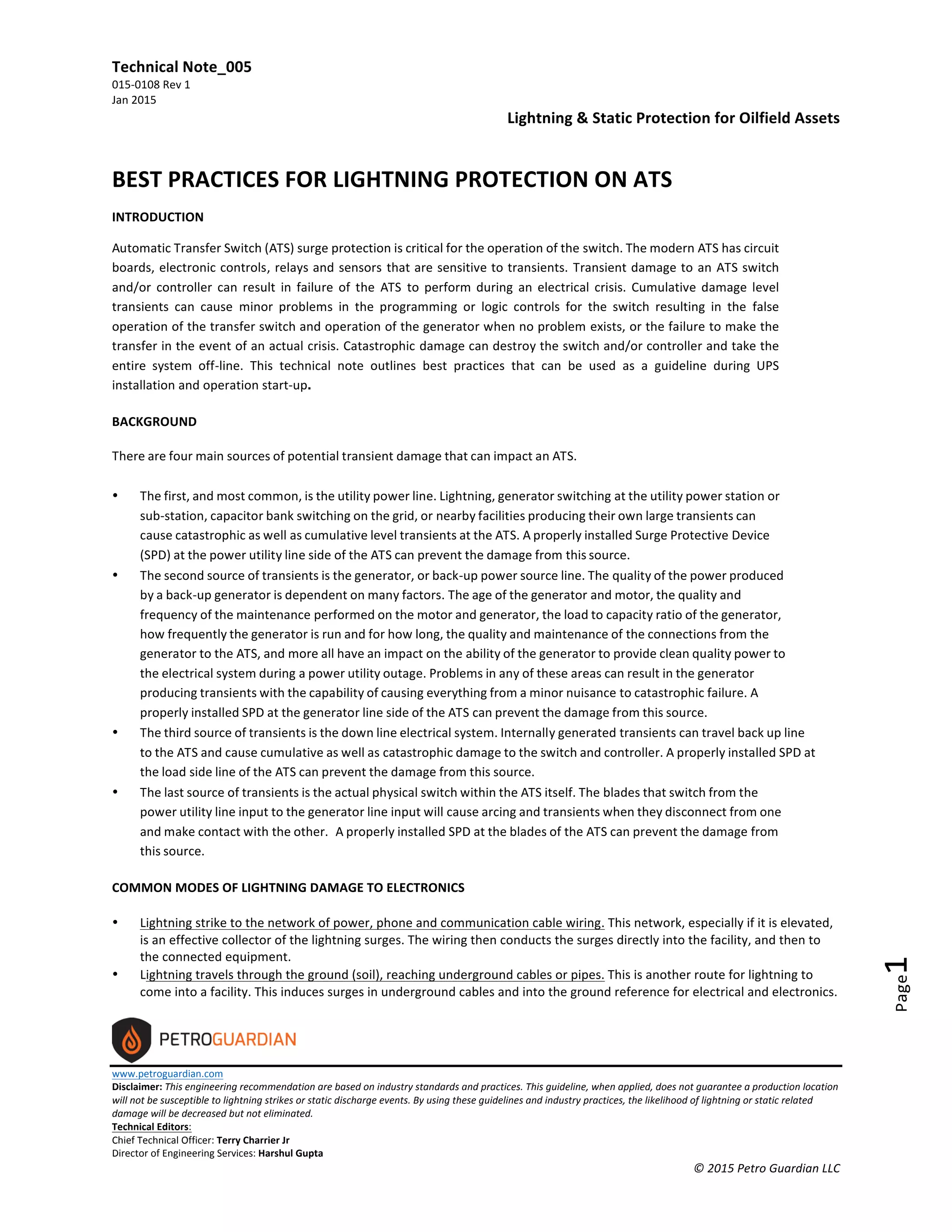 This technical note outlines the importance of surge protection for automatic transfer switches (ATS) in oilfield operations to prevent damage from lightning and static discharges. It identifies four primary sources of transient damage and recommends the installation of surge protective devices (SPDs) to mitigate risks. Proper selection, sizing, and installation of SPDs are critical for the protection and longevity of ATS systems during electrical crises.