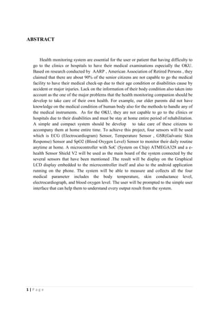 This document describes a proposed health monitoring companion device that would measure various health parameters for users through sensors. It would use an Arduino Uno microcontroller connected to an e-health sensor shield with four sensors: ECG to measure heart rate, temperature to measure body temperature, GSR to measure skin conductance, and SpO2 to measure blood oxygen levels. Readings would be displayed on a graphical LCD and sent to an Android application. The goal is to help users monitor their health at home without needing to visit medical facilities by making the device simple to use and understand.