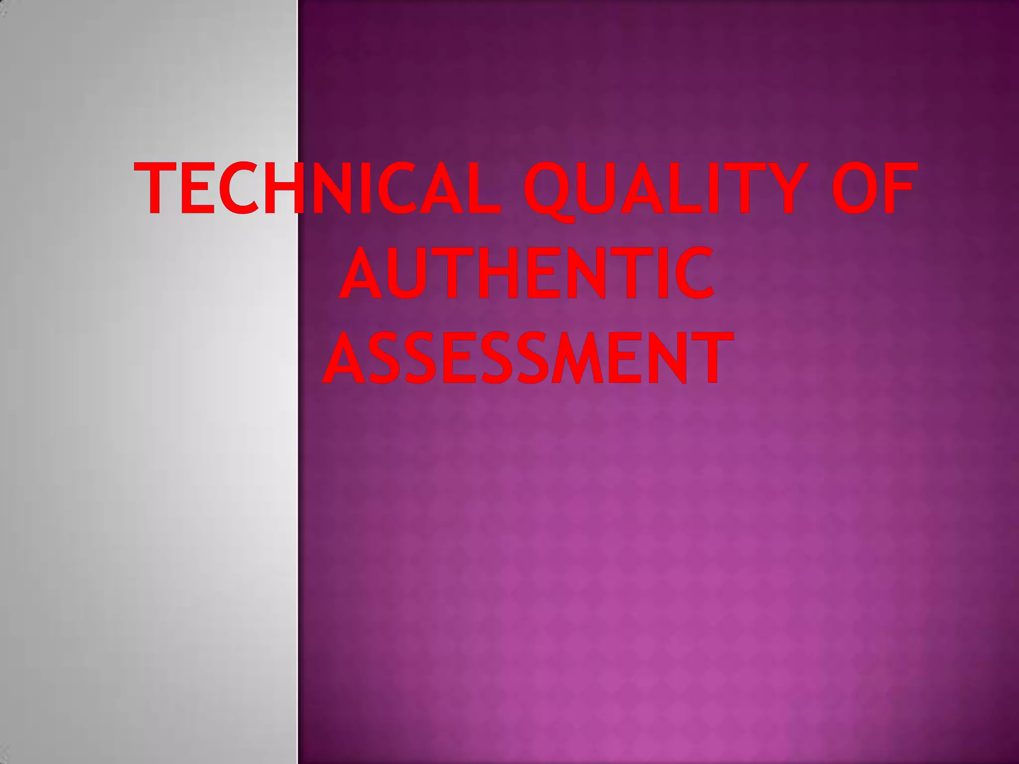 This document discusses reliability and validity in authentic assessment. It defines reliability as consistency in scoring and validity as measuring what is intended. Reliability features like inter-rater reliability and using scoring rubrics are described. The document also discusses considerations for training raters and ensuring reliability. Grading is introduced as systematically reporting student performance to communicate achievement levels to teachers, students and parents.