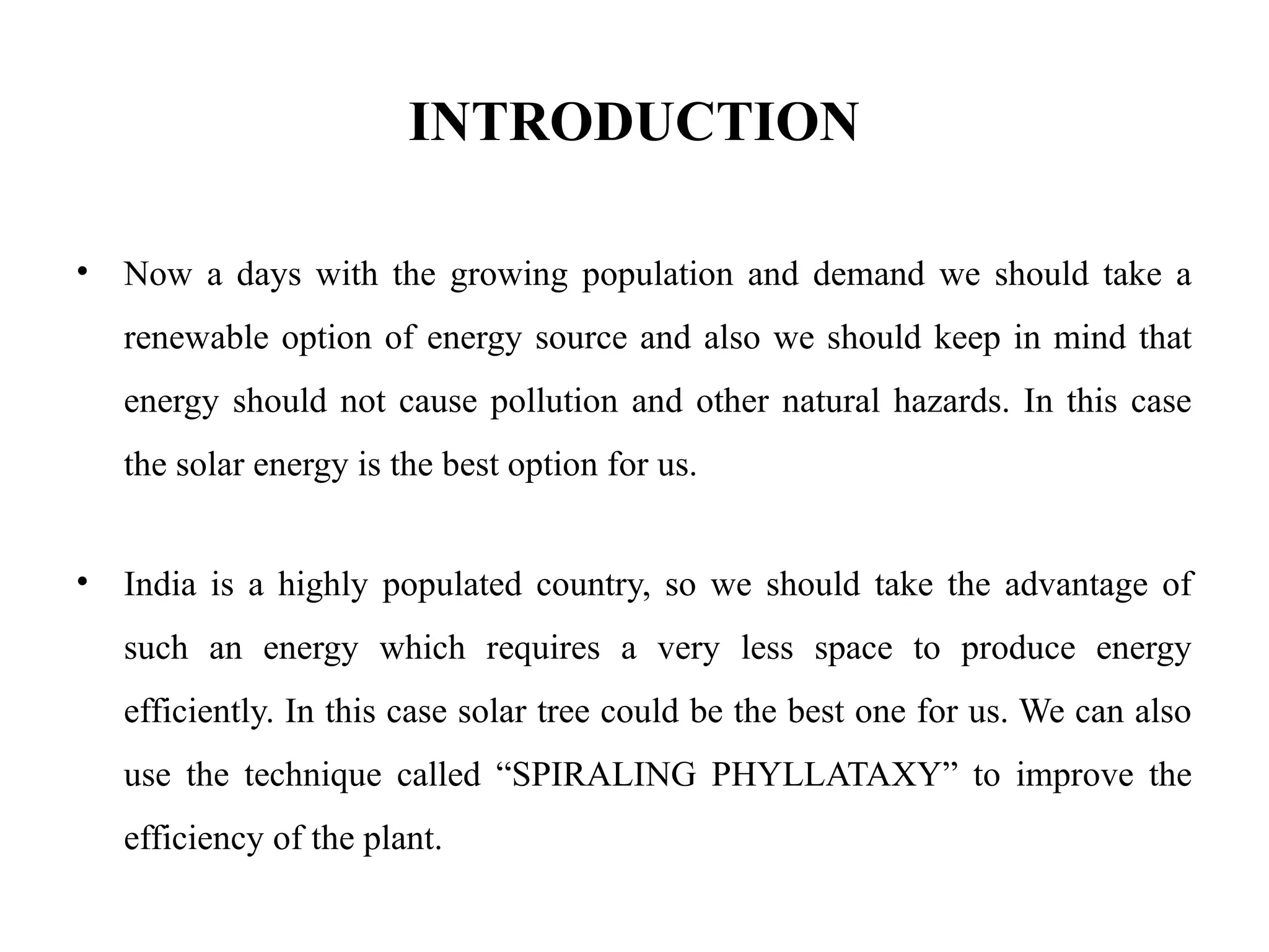 The document discusses solar trees as a renewable energy solution designed to efficiently generate electricity while occupying minimal space, particularly in densely populated areas like India. It outlines the components, working principles, advantages and disadvantages of solar trees, highlighting their ecological benefits compared to traditional solar systems. The conclusion emphasizes the potential of solar trees to meet energy demands, conserve land, and contribute to the power grid.