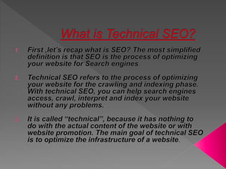1) Technical SEO consists of various checks and settings to help search engines crawl and index a website properly.