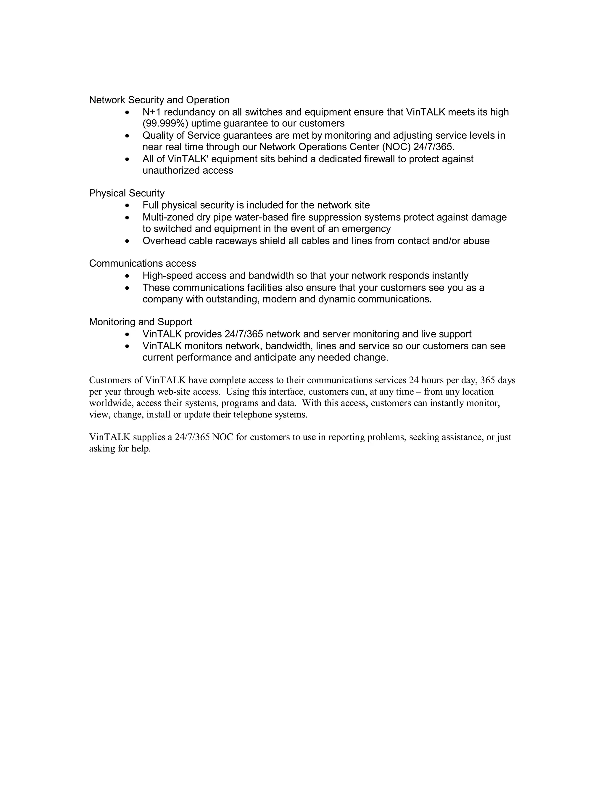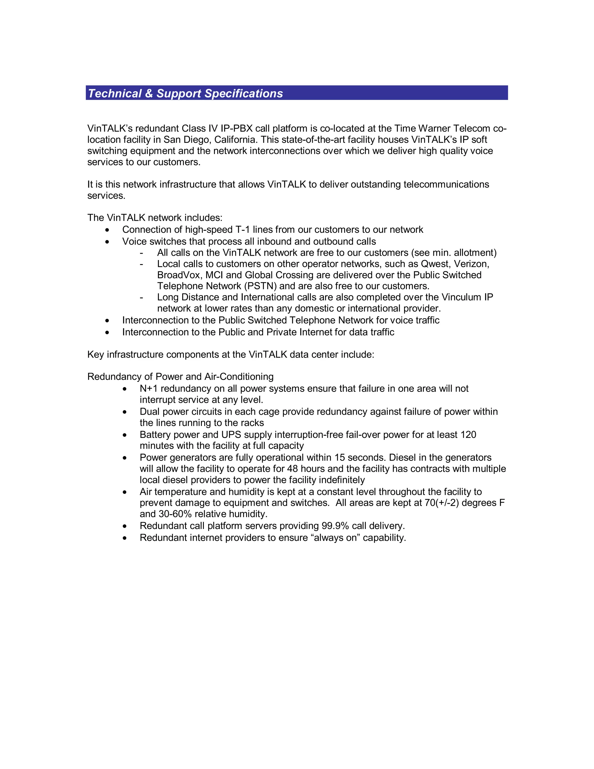 VinTALK's redundant Class IV IP-PBX call platform is located at a state-of-the-art colocation facility in San Diego, California which houses VinTALK's switching equipment and network interconnections to deliver high quality voice services. The network infrastructure includes connections to customer T-1 lines, voice switches to process calls between VinTALK customers and other networks, and interconnections to the public telephone and internet networks. Key infrastructure at the data center provides redundancy of power, air conditioning, call platform servers, internet providers, switches, and equipment to ensure 99.999% uptime.