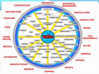 The document discusses technical textiles and the buildtech textile market in India. It states that buildtech textiles are used in construction for buildings and structures like membranes, tarpaulins, awnings, and scaffolding nets. It provides figures estimating the Indian buildtech market was worth $547.1 million in 2009-2010, with over 50% contributed by tarpaulins and around 40% by floor and wall coverings. High-strength textile fabrics made from fibers like aramid, carbon, and glass are increasingly being used in construction as replacements for materials like wood, concrete, and steel due to their mechanical properties.
