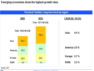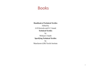 The document discusses technical textiles, providing definitions and discussing various types. It summarizes that technical textiles are manufactured primarily for performance or function rather than aesthetics. The document then discusses 12 end use areas of technical textiles: agrotech, buildtech, clothtech, hometech, geotech, indutech, medtech, mobiltech, oekotech, protech, packtech, and sporttech. For each area it provides 1-2 examples of products used. The document emphasizes that technical textiles have a variety of applications across many industries due to their functional properties.
