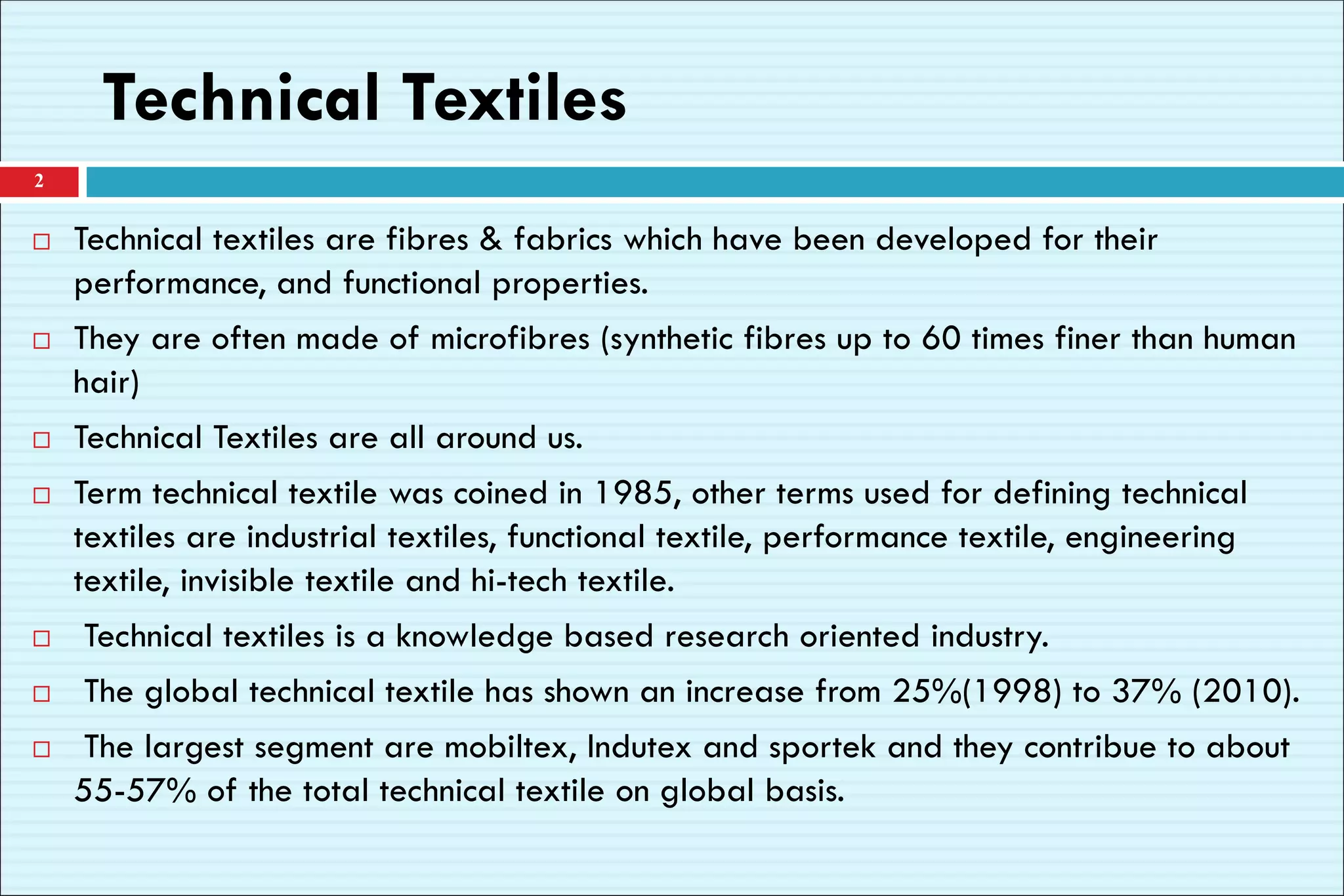 This document provides a comprehensive overview of technical textiles, which are specialized fibers and fabrics designed for specific functional properties across various industries. It outlines different classifications of technical textiles, including applications in agriculture, automotive, construction, clothing, and medical fields. The document also highlights the advantages of technical textiles such as cost efficiency, durability, and versatility.