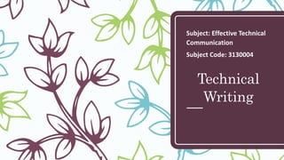 The document is a presentation on effective technical communication and report writing. It discusses what a report is, how to plan and prepare a report, the typical structure of a report including sections like the introduction, body, and conclusion, and tips for writing reports. It also covers different types of reports for academic, business, and technical contexts. Sample report content is provided on a cultural fest event held at a school.