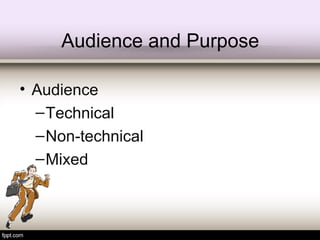 This document outlines the technical writing process for business reports. It discusses determining the audience and purpose, analyzing the audience's technical background and interests to tailor the appropriate level of detail. It also covers collecting and organizing data from various sources, writing and editing the report for the audience, and packaging the final report with standard formatting and references. The key steps are analyzing the audience, defining the problem based on the purpose, and writing from the audience's perspective so they can act on the findings.