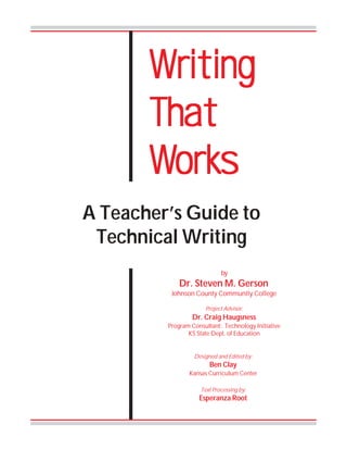 This document provides a rationale for teaching technical writing in schools. It defines technical writing as communication written for business and industry, focusing on products and services. The document notes that technical writing skills are important for students' future careers, as most writing jobs will involve memos, letters, reports and other technical documents rather than essays. It compares technical writing to essays and other types of writing, noting the differences in style, organization and development. Finally, it discusses five key components of writing that are important for both technical writing and essays: grammar, organization, development, document design and style.