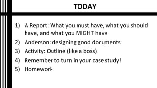 This document provides guidance on formatting a report. It outlines what a report must, should, and might include. A report must have a title, introduction, reference list, content with headings, and conclusion. It should use signposting, include data visualization, and be well designed. A report might need an appendix, table of contents, separate title page, summary/abstract, or include multimedia links. The document emphasizes designing the report with a grid format to make the information easy to access and read. Students are instructed to create a "design-minded" outline focusing on how they want to present their report.