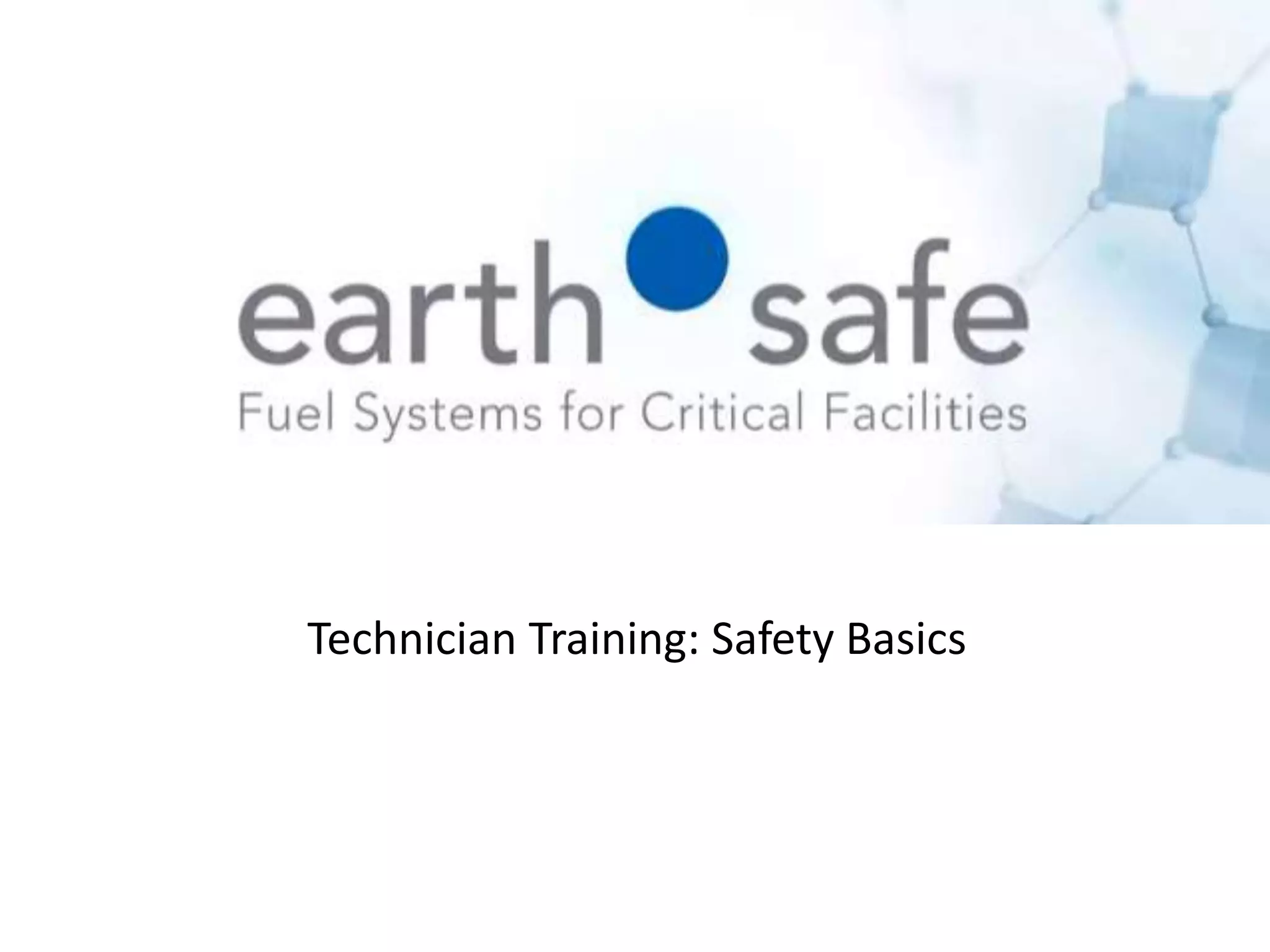 This document provides an overview of safety basics for technician training, including general safety, electrical safety, mechanical safety, and preventing spills and overfills. It outlines key safety requirements such as following detailed lockout/tagout procedures, checking that equipment is de-energized before working on it, making sure piping and tanks are properly isolated and drained before work, wearing appropriate protective equipment, attending safety meetings, and being aware of electrical area classifications and their implications. Compliance with comprehensive jobsite safety programs is critical.