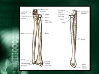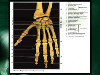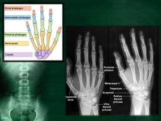 The document provides guidelines for taking radiographs of the hand and digits. It describes the anatomy of the hand and divides it into phalanges, metacarpals, and carpals. It then gives positioning instructions for anteroposterior, lateral, and oblique views of the individual digits and hand, including the thumb. Evaluation criteria for each view are provided to ensure clear visualization of bones and joints.