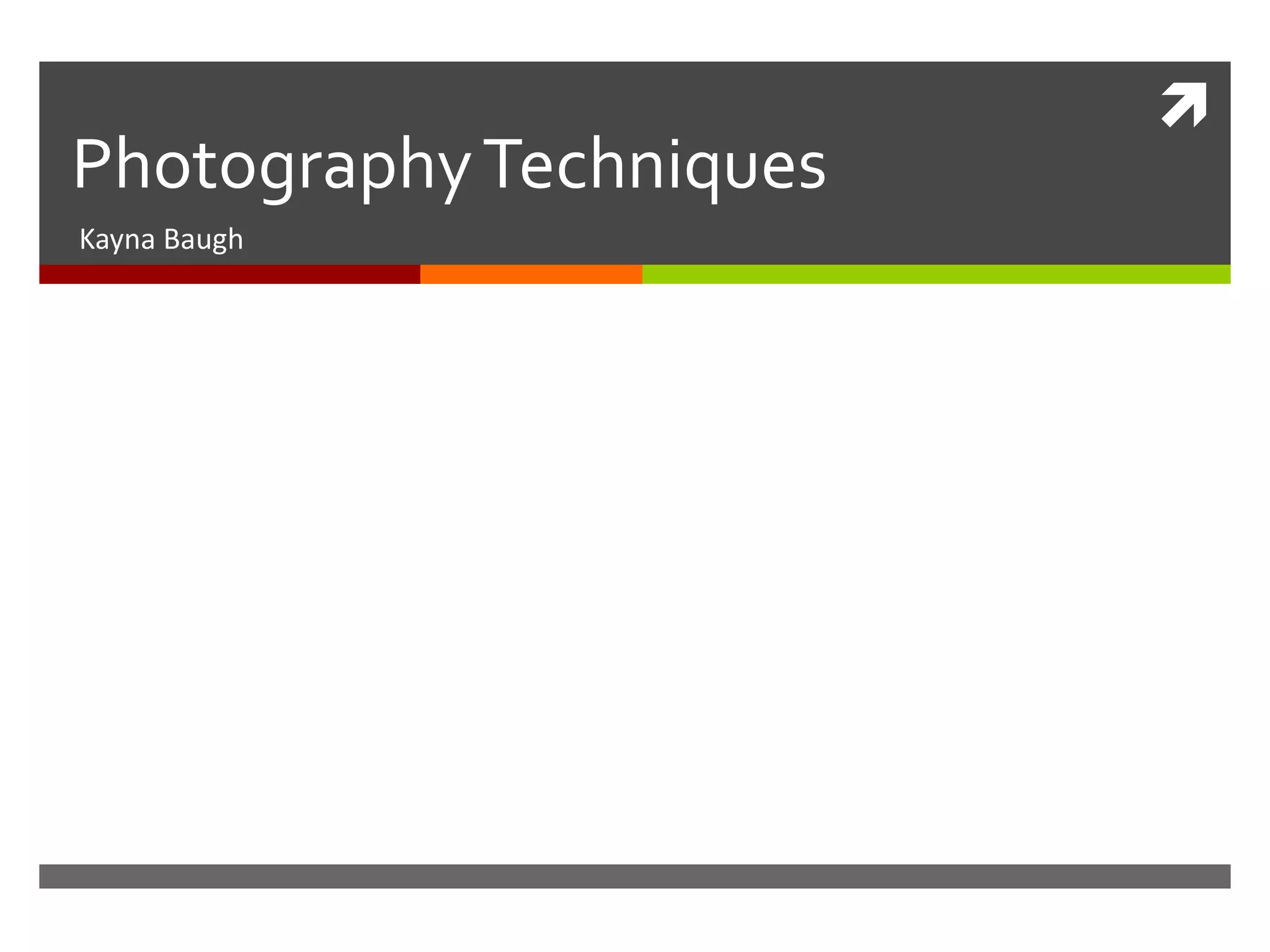 This document provides examples and descriptions of various photography techniques, including monochrome, composition, format, centre of interest, viewpoint, rule of thirds, light, close up, leading lines, texture, repetition, and narrative. For each technique, an example image is given along with analysis of how that technique is used. The document also includes examples of images taken by the author to demonstrate some of the techniques.
