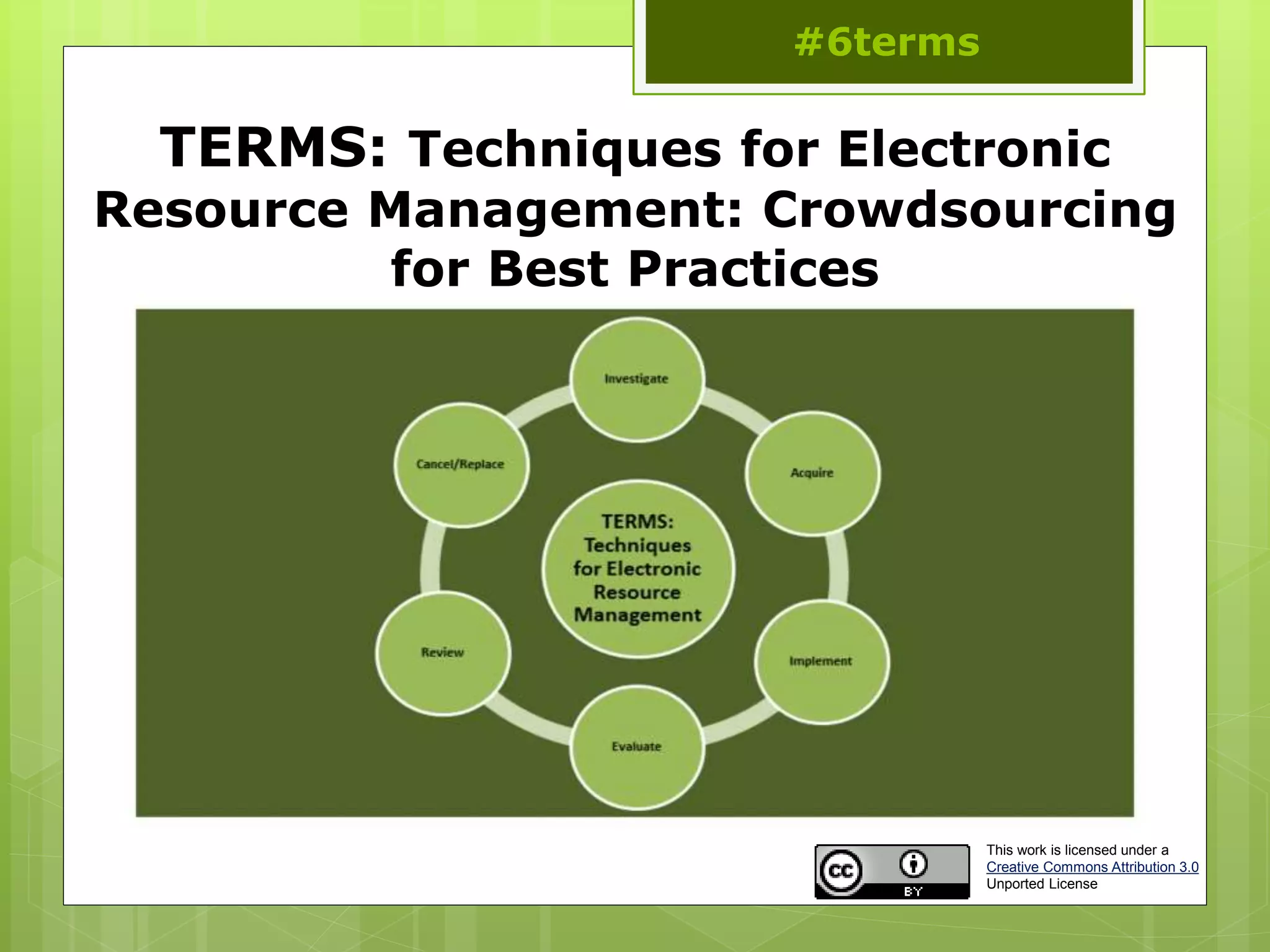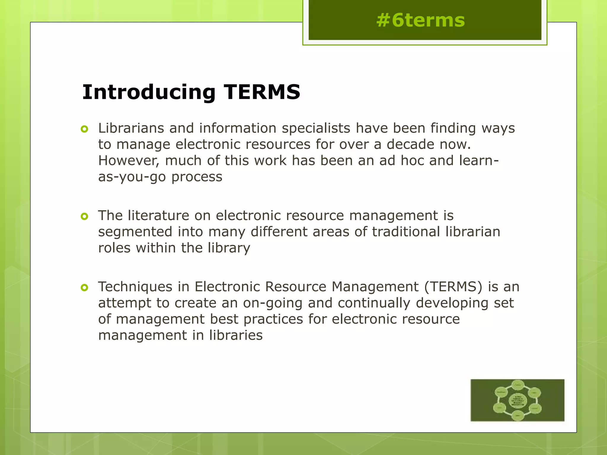 The document outlines the Techniques in Electronic Resource Management (TERMS), discussing best practices and workflows for managing electronic resources in libraries. It highlights various stages including needs assessment, acquisition, implementation, ongoing evaluation, and cancellation processes. The document emphasizes the importance of structured workflows and collaboration among library staff to improve management efficiency and user engagement.
