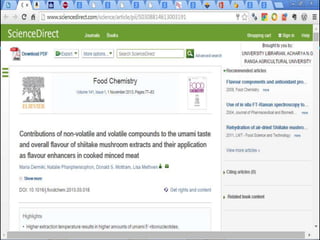 The document discusses techniques for analyzing food flavor compounds. It begins with an introduction to flavor, defining it as both a sensory sensation and the components that produce that sensation. It then covers various techniques for isolating volatile flavor compounds from foods, including headspace extraction methods like static headspace, dynamic headspace, and solid phase microextraction, as well as distillation and extraction techniques like steam distillation, solvent extraction, and simultaneous distillation-extraction. The document emphasizes that the choice of isolation technique depends on the objective and nature of the analyte compounds.