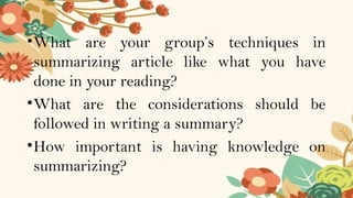 The document discusses techniques for summarizing academic texts, emphasizing the importance of condensing the author's ideas into 100 to 200 words. Key strategies include mentioning the title and author, stating the thesis in the first two sentences, and maintaining logical coherence while omitting non-essential details. It also highlights the need to paraphrase adequately and avoid personal opinions to prevent plagiarism.
