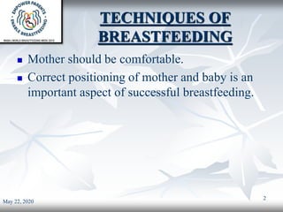 The document discusses techniques and issues in breastfeeding, highlighting the importance of maternal comfort, correct positioning, and proper latching. It outlines various breastfeeding positions such as cradle hold, cross cradle hold, side-lying, and football hold. Additionally, it identifies common breastfeeding issues like cracked nipples, breast engorgement, and challenges faced by working mothers.